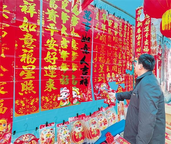 1月11日,市民在挑選對聯(lián)。當日,記者在中心城區(qū)走訪時看到,琳瑯滿目的春節(jié)飾品已火熱上市,不少商家把一個個大紅燈籠高高掛起,市民采購年畫、福字、對聯(lián)、窗花、中國結等春節(jié)飾品,“囤貨”迎春節(jié)。